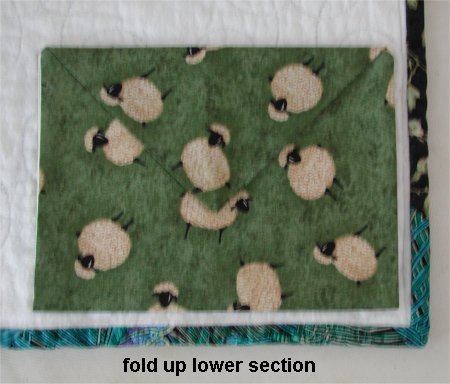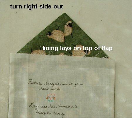 | Step 7. Fold up the lower edge so that the lower edge of the envelope meets the top of the lining fabric. Press flat. Fold the flap down. Press flat. At this point, you can make a buttonhole in the flap and sew a decorative button on the envelope ... OR ... you can sew use snaps (decorative, metal or invisible plastic) ... OR ... some other method of securing the flap to the envelope. (I do not have a photo showing any buttons/snaps/etc .. the flaps in my pictures are loose.) | |