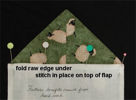 ![]() | Step 6. Fold the raw edge of the lining to the inside about 1/4" (more or less). It should cover the raw edge of the flap. Hand or machine stitch the folded edge of the lining to the flap. You can also use a decorative stitch along this edge. For this example, I hand stitched the edge down, using a blind stitch. |