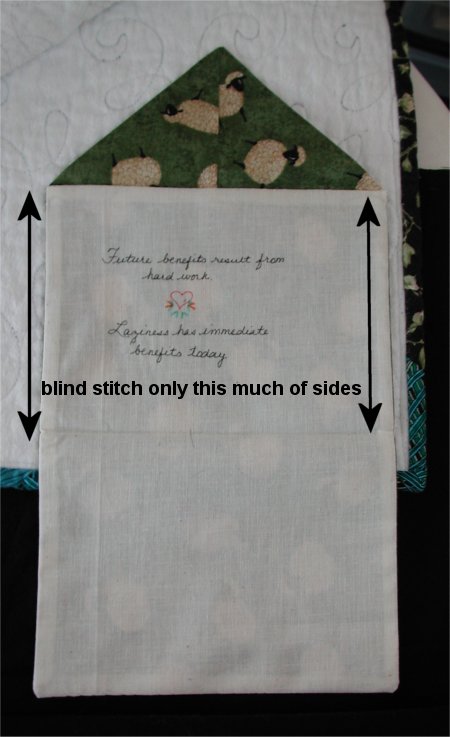 ![]() | Step 9. Open up the envelope and hand stitch the middle third sides ONLY to the quilt. Voila! Your envelope quilt label is completed! |