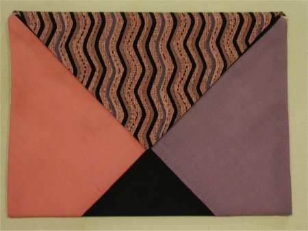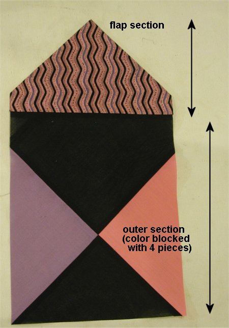 ![]() | Preparation. This is the right side of the fabric, with the flap corner already sewn and turned. You can see that I've used three different fabrics. The flap is the striped fabric. It's 7-1/2" x (about) 4". The rest is the lower envelope. It's 7-1/2" x (about) 10-1/4". All seams are 1/4". To create the color blocked lower section, I made a giant sized 4-patch, turned it on-point and then cut the 7-1/2" x (about) 10-1/4" rectangle. This was then sewn to the striped fabric rectangle. The resultant rectangle should be trimmed to 7-1/2" x 14-1/4", which is the measurement of the flap and outer envelope fabric of the Basic Envelope Quilt Label. |
