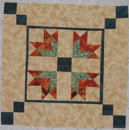 This project will teach the construction of one freezer paper pieced block, which when duplicated 3 more times will result in a quilt block suitable for a throw pillow cover or as part of a larger quilt. The block is used by permission from Judy Martin, who offered it as a November 2002 Block-of-the-Month. It is no longer available.
