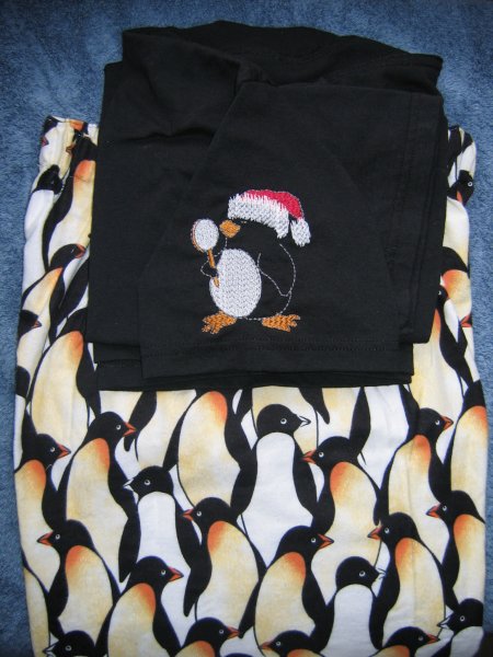 My youngest DD (currently) likes penguins; she thinks they are cute. Some time ago (maybe last year, maybe before that .. I don't quite remember), I found a delightful piece of realistic penguin flannel. Since my daughters like to wear flannel bottoms and over-sized t-shirts for tops as jammies , I knew the penguin flannel would be perfect for a Christmas present. But, since relations with the aforementioned daughter can be somewhat prickly ... and I don't feel like rewarding bad behavior with presents .... the penguin flannel languished in my stash for at least two years.