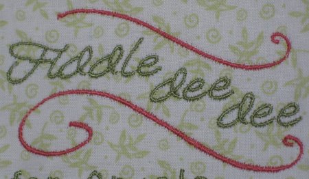The Embroidery Part From Amazing Designs, I serendipitously found a free design with the words "Fiddle dee dee"! How perfect! (I can't find this freebie on their website any longer). The only aspect that I was concerned about was the outline stitches. The fabric being embroidered needs to be stabilized properly AND the design needs to be digitized properly for the outline stitches to track properly.