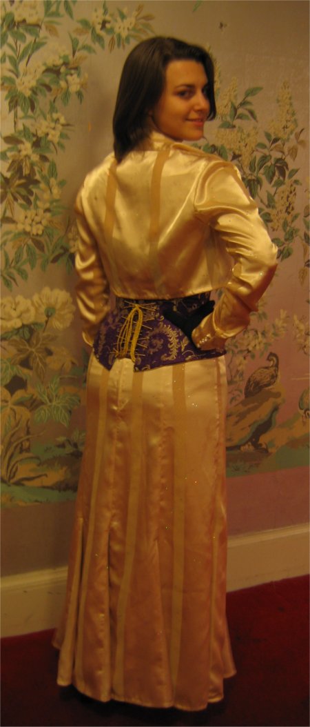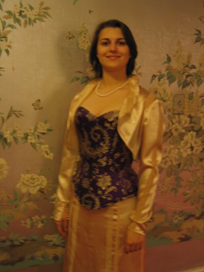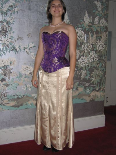 I was very, very, VERY pleased that I was able to match the brocade pattern across the center front. The back of the corset can be seen in this picture.
