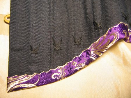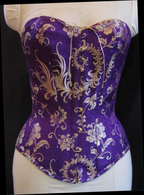 As this corset is not anticipated to be worn extensively, it was with much expert advice that I decided to make it a two layer corset. One layer of black coutil, to which boning channel tape was stitched. One layer of fashion fabric ... the purple and gold brocade, which was interfaced with woven fusible interfacing. The back section of coutil was extended 2" at the center back, folded over on the center back line so that there were 2 layers of coutil to stitch through to create the back boning channels and through which the grommets could be set. The boning channel tape is sandwiched between the coutil and the fashion fabric. Spring steel is on either side of the grommets to provide support for lacing; spiral steel is everywhere else.