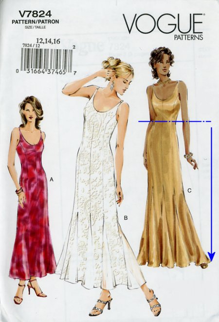 Next project: the skirt and shrug! Lisa really likes the look of gored skirts or skirts with godets. I found Vogue V7824, a dress pattern, that had the perfect skirt. It's an easy matter to modify the dress pattern to eliminate the bodice and use the skirt part as a stand-alone skirt, as shown by the blue line & arrow in the picture.